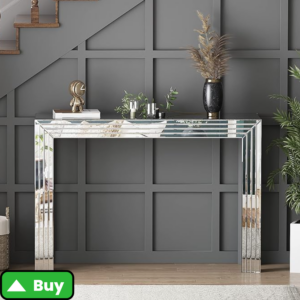- Why It Works: Mirrored console tables are all about drama and light. They bounce natural and artificial light around, making your space feel larger. They’re perfect in entryways or bedrooms where you want a touch of elegance.