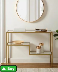 - Why It Works: Glass-top console tables exude sophistication while keeping your space light and airy. They’re fantastic for smaller rooms as the transparency doesn’t visually clutter the space. Look for smoked or tinted glass for a trendy touch.