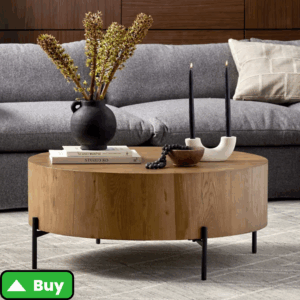 These tables are available in hammered brass, distressed wood, or painted ceramic finishes. A round drum table adds visual weight and works well when you want to play with varying heights in your living space. Bonus: many styles offer hidden storage inside.