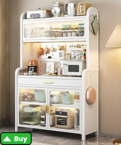 Traditionally used in kitchens, baker’s racks are increasingly popular in dining rooms. They can store cookbooks, glassware, or decorative items with a mix of shelving and cabinets. Open shelving makes them ideal for displaying beautiful dishware or plants.