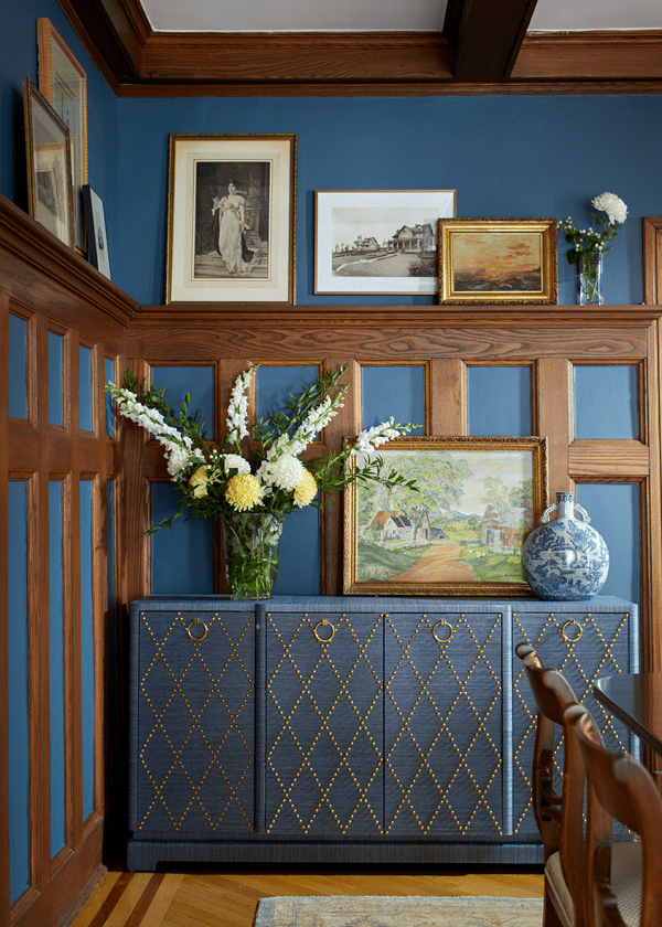 Yet, they dreamt of a cozy living room anchored by a stunning blue velvet sofa and wanted to incorporate several cherished antiques and sentimental art pieces throughout the space.