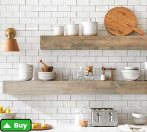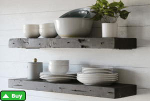 In the kitchen, floating shelves can serve both functional and decorative purposes. Choose sturdy, wide shelves made from walnut, maple, or mango wood to hold your everyday dishes, glasses, and even some pantry staples. To keep it functional, ensure frequently used items are within easy reach. To keep it chic, use matching dishes and glassware sets and store dry goods in stylish containers. Adding a few cookbooks, small plants, and decorative kitchen items can elevate the look. Ensure the shelves are installed securely to handle the weight, and consider under-shelf lighting to highlight your displays and provide task lighting.
